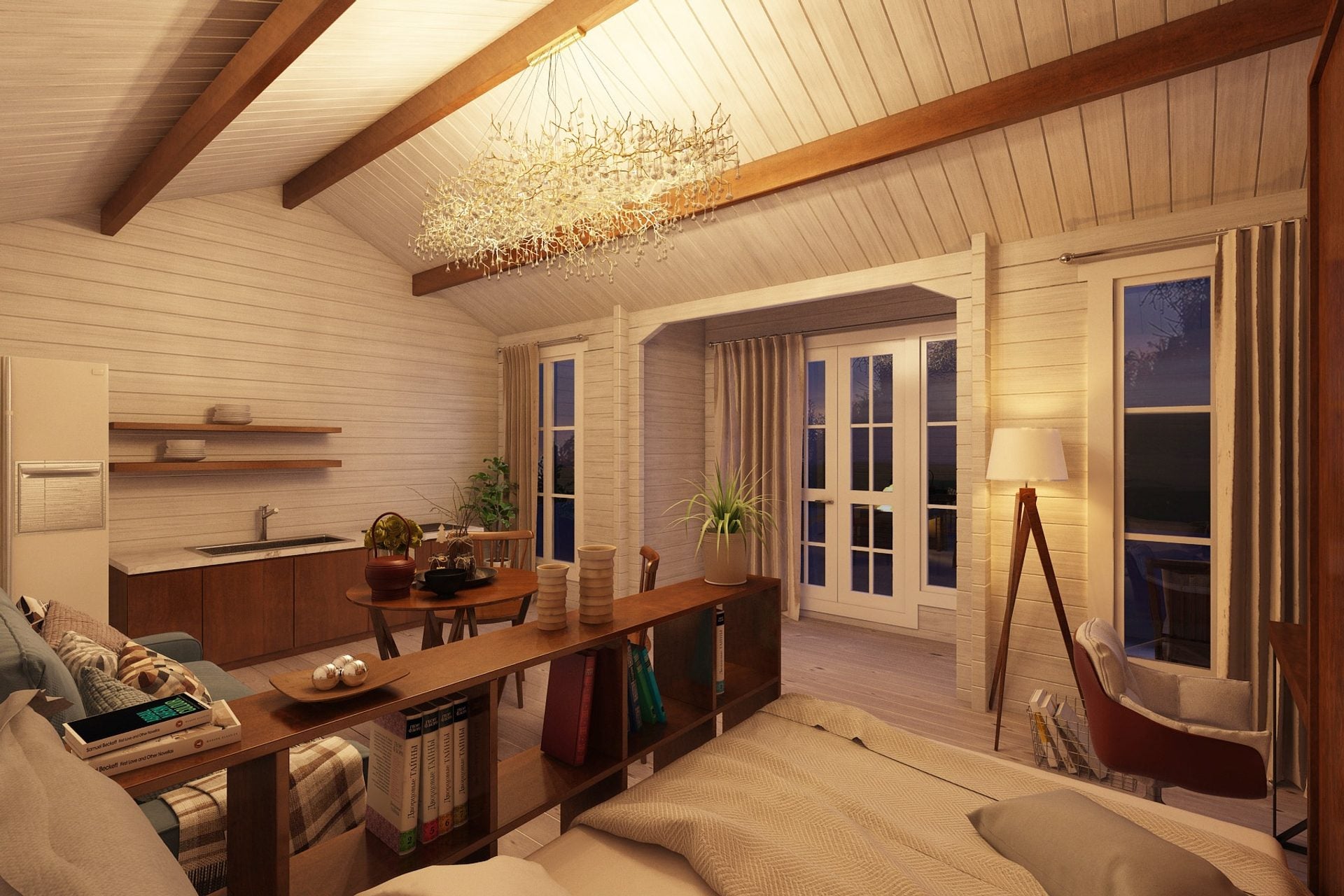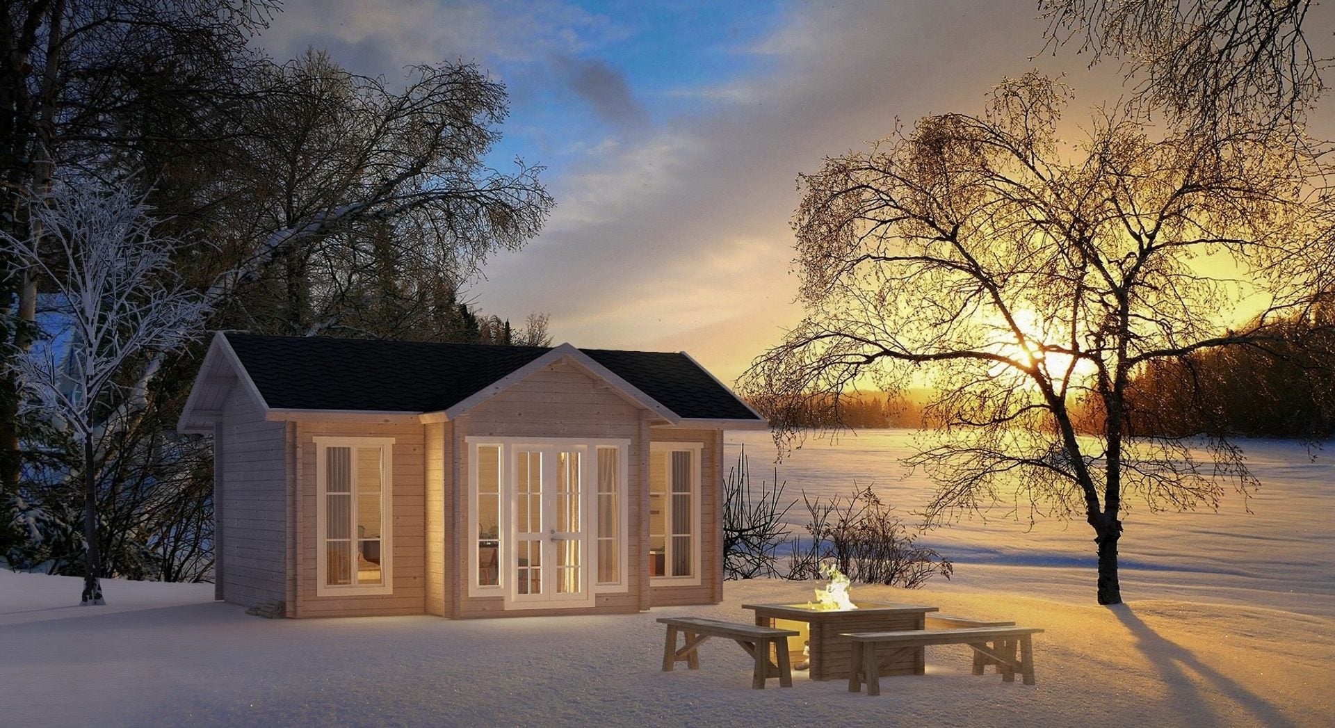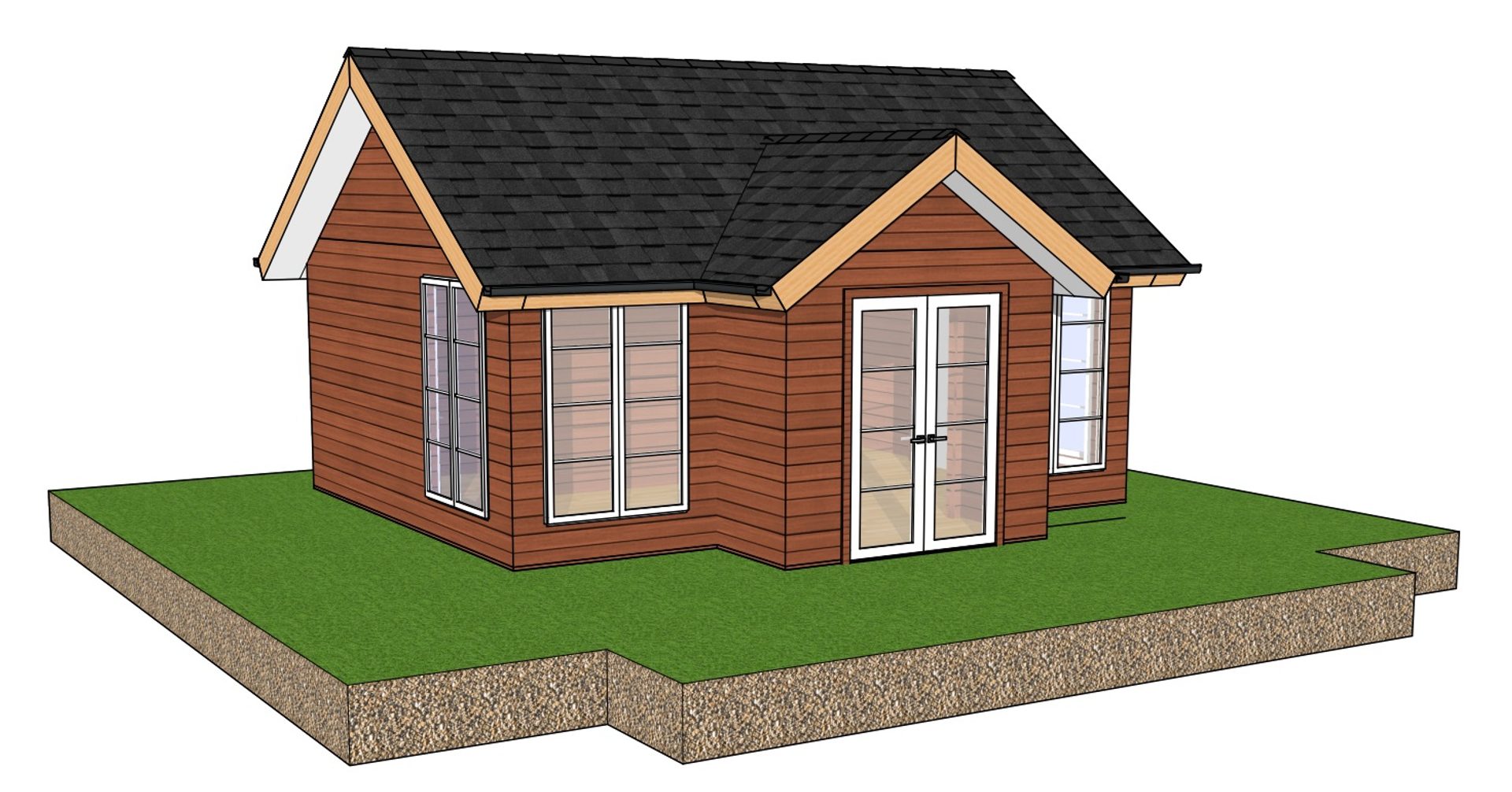 - 1 vindue. Dobbelt indgangsdør (helglas): 1400 x 2000 mm, isoleret glas Ikke inkluderet: Tagdækning, isolering, skruer og søm