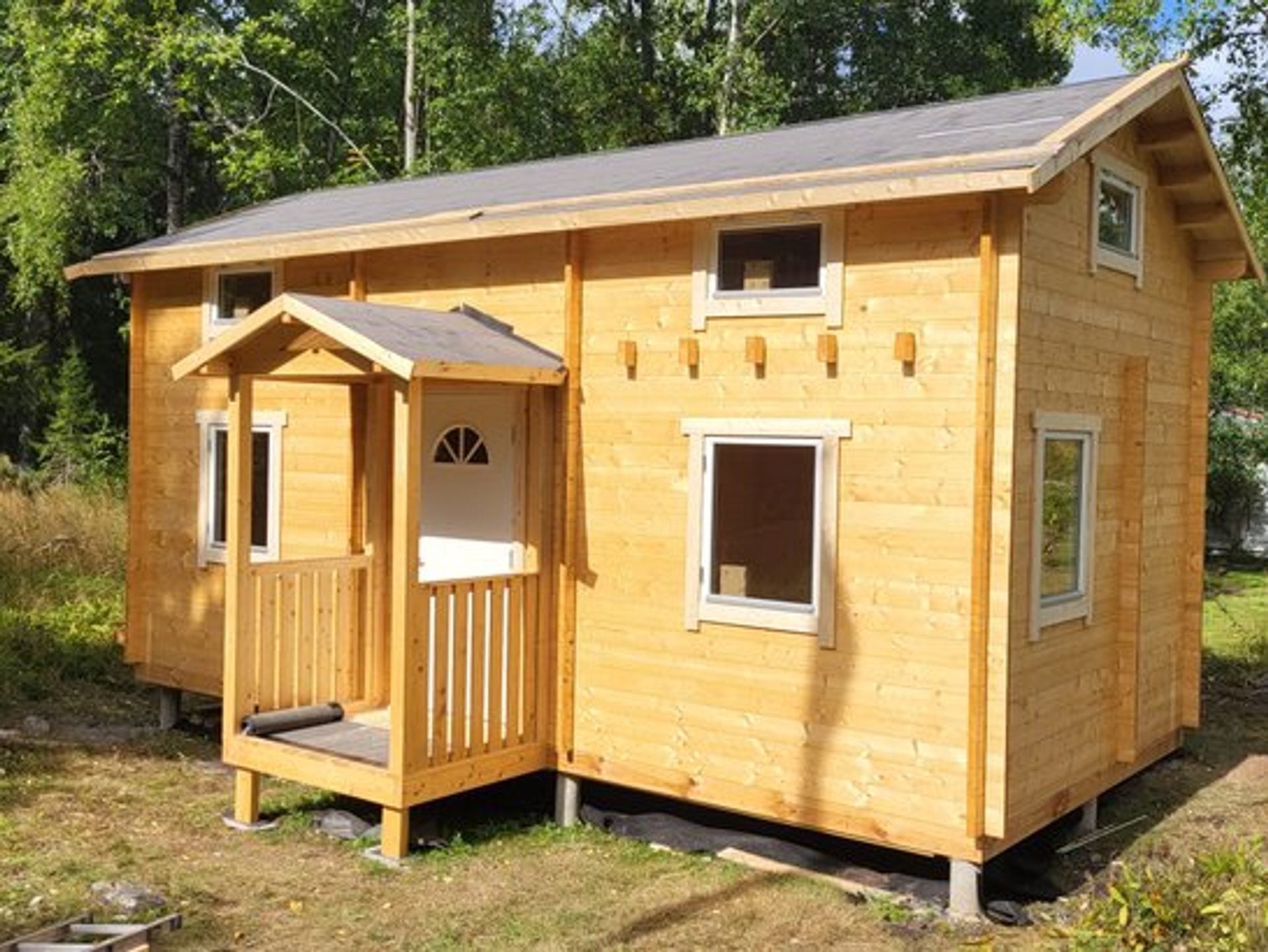 Sehr schöne Hütte, die an ein echtes Haus im Modell erinnert. Torild ist eine luxuriöse Attefallsstuga von 25 qm + 8,5 qm Schlafboden. Auch erhältlich als Bolundare 30 qm. Wie ein traditionelles kleines Haus mit einem vorderen Zimmer und Schlafboden, sehr schön. Optimale Grundriss, mit Wohnzimmer / große Hütte von ca. 14,8 qm und zwei kleinere Zimmer von ca. 4 qm und 3,3 qm, die sowohl WC und Kochnische / Küche beherbergt, wenn Sie wollen.