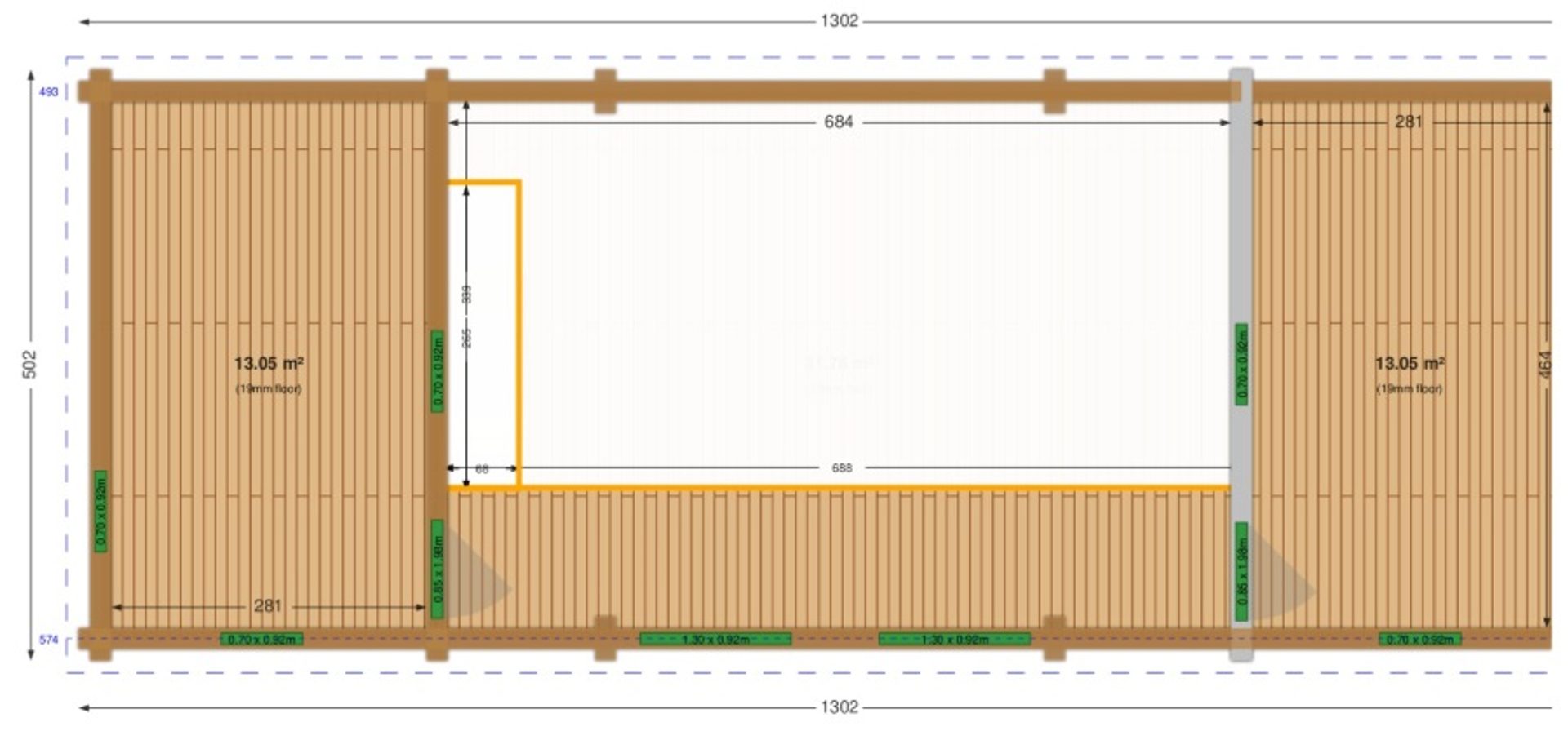 | 7800 kg | 5 m | 4,55 m | 8,2 m | 8-10 astetta | Höylätyt ja oksatut seinäprofiilit (44-90 mm:n sahatavaran paksuus) | 28 mm hienohöylätty lattiapalkkeihin 60/68/70 x 140/160/180/200 mm. | 19 mm x 100 mm hienoksi höylätty raakalevy kattoharjanteilla 60/68/70 x 180/200 tai 280 mm. | Solmittu puurunko, jossa on parvi, 2 tasoa (seinien paksuus 44-90 mm). | Myöhäispuustoinen pohjoismainen kuusi, käsittelemätöntä ja maalaamatonta puuta. | noin 45 neliömetriä | noin 54 neliömetriä | 45 + 15 neliömetriä | 15 neliömetriä |
